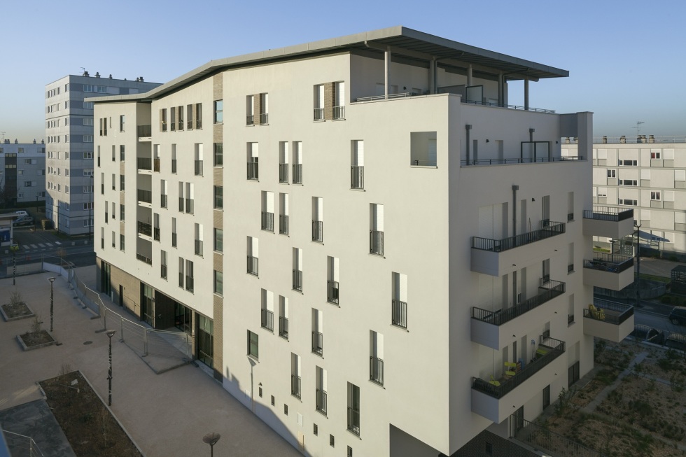Au-dessus de ce socle unitaire, le volume est fragmenté en deux bâtiments (accession sociale / locatif sociale) et se retraient côté sud pour favoriser l’ensoleillement du jardin sur dalle.