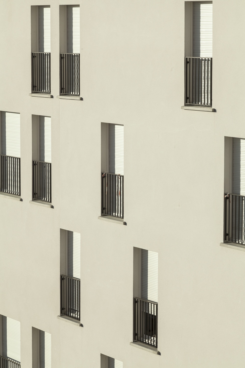 Les balcons tirés horizontalement sur trois étages successifs donnent la solidité et franchise nécessaire sur les espaces publics dans un quartier des années 60 aux volumétries très simples.