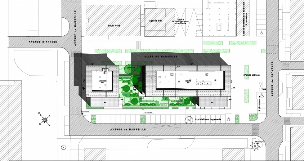 Les étages courants se posent sur le volume général du socle qui donne forme aux espaces publics créés ou réaménagés.