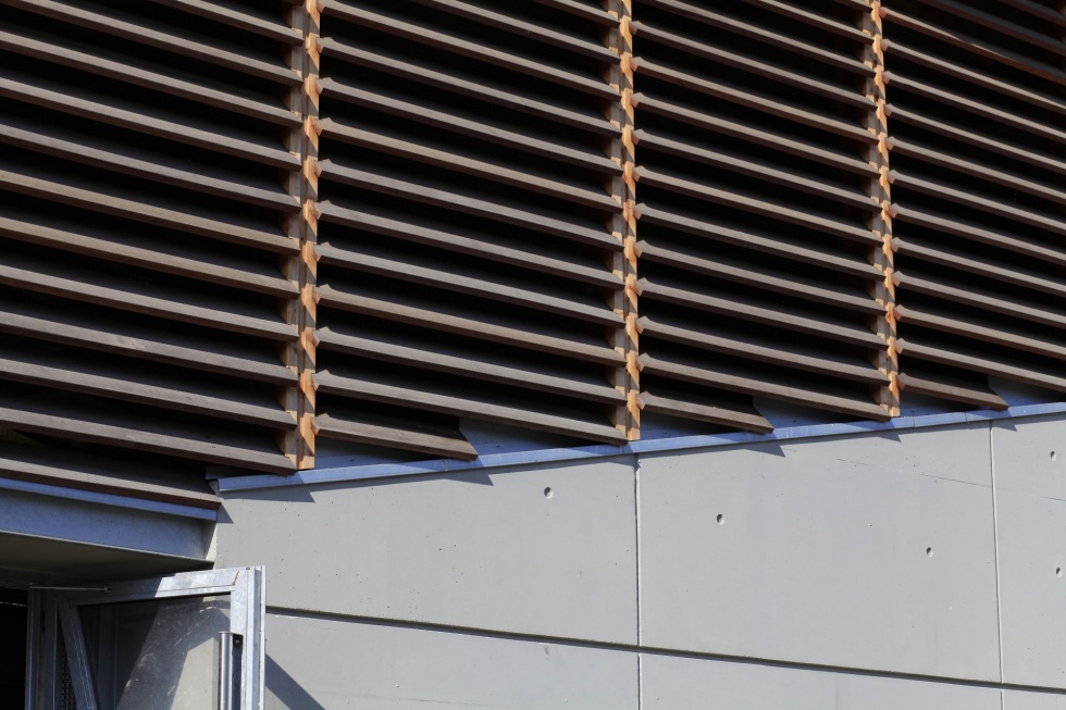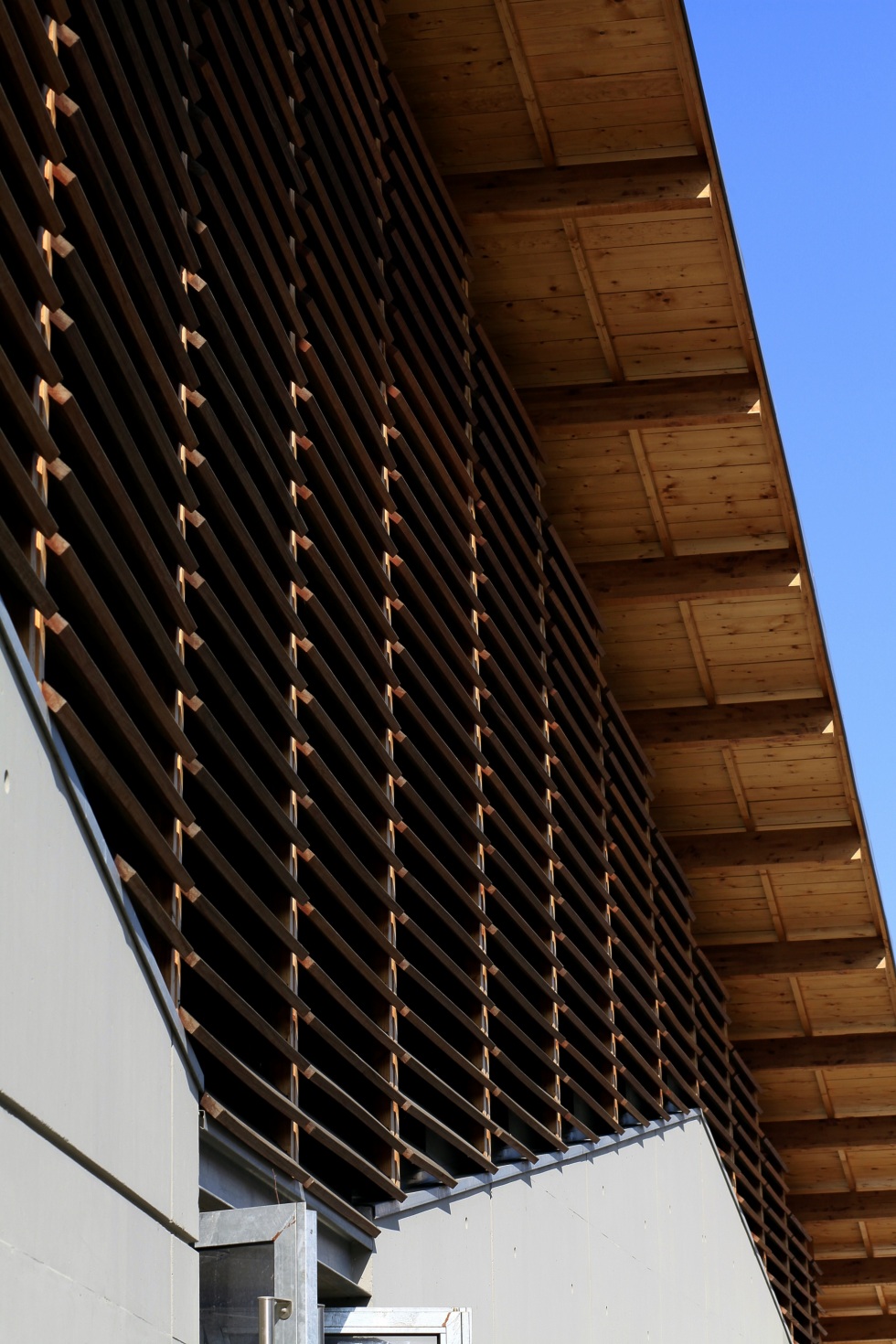 Tous les efforts de la charpente en bois lamellé-collé sont ramenés sur une file centrale de poteaux auto-stables. Là encore, en échappant à la solution classique des portiques, les longues façades en persiennage ne sont qu’un pan de bois léger ne reprenant que des charges verticales sur une multitude d’appuis de section très fine.