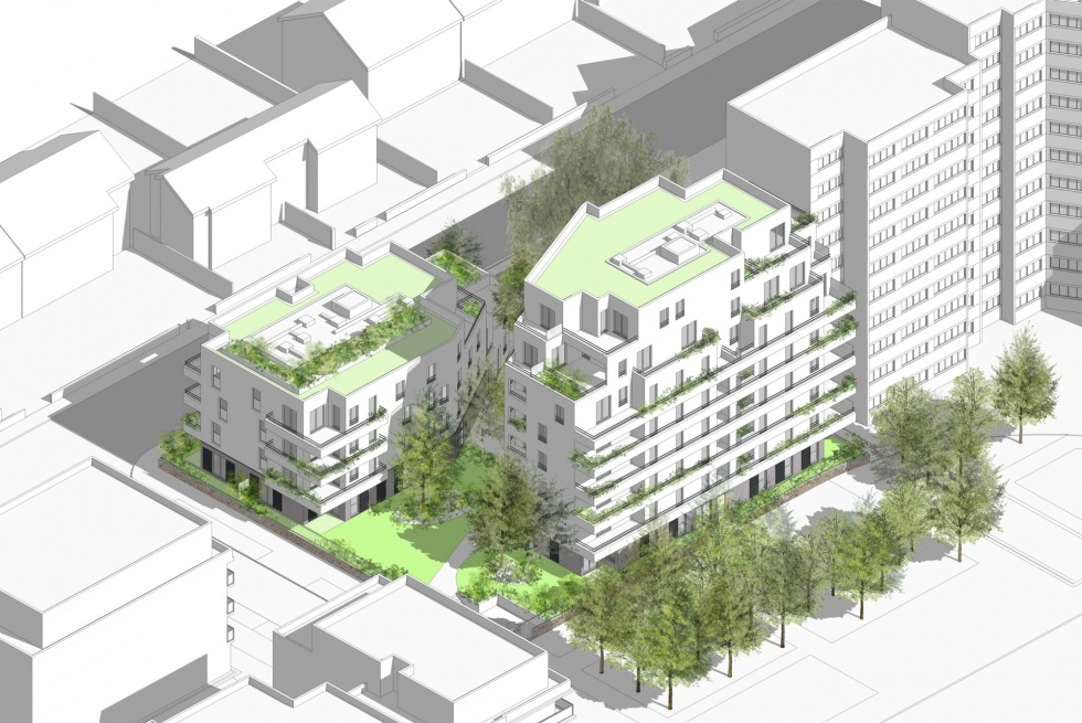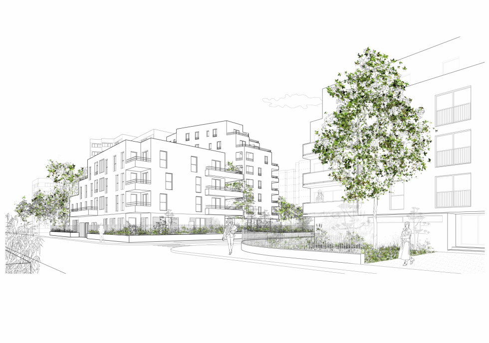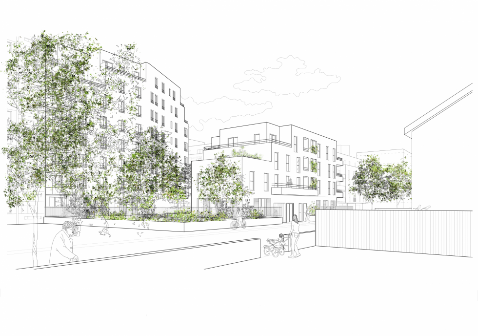 L’îlot Nbis s’adosse à un existant de 10 niveaux, mais est aussi en vis-à-vis d’un petit tissu pavillonnaire. Plutôt que de passer de l’un à l’autre par un gradinage complexe, le choix proposé est de fragmenter l’îlot en un bâtiment R+5/R+7 en mitoyenneté du R+9 et face au grand square, et un autre R+2/R+3 face au pavillonnaire.